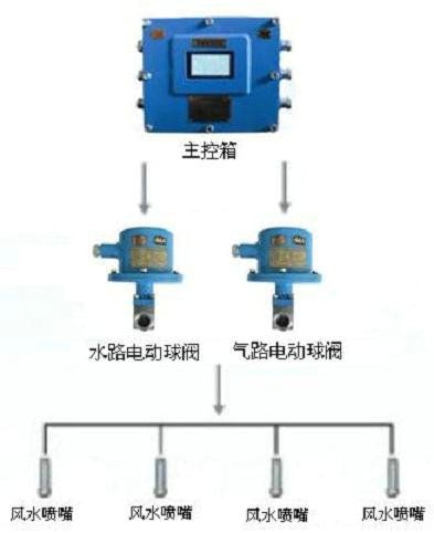 當(dāng)傳感器探測到控制信號時,信號送入主控箱,主控箱先后控制高壓風(fēng)閥、高壓水閥開啟,將高壓風(fēng)、高壓水輸送到風(fēng)水噴頭(即氣水噴頭)進行噴霧降塵(風(fēng)水噴頭可對風(fēng)水壓力大小進行調(diào)整),噴霧工作至延時時間(延時可調(diào))停止噴霧降塵;當(dāng)信號再次觸發(fā)時,進行下一個工作循環(huán)過程。