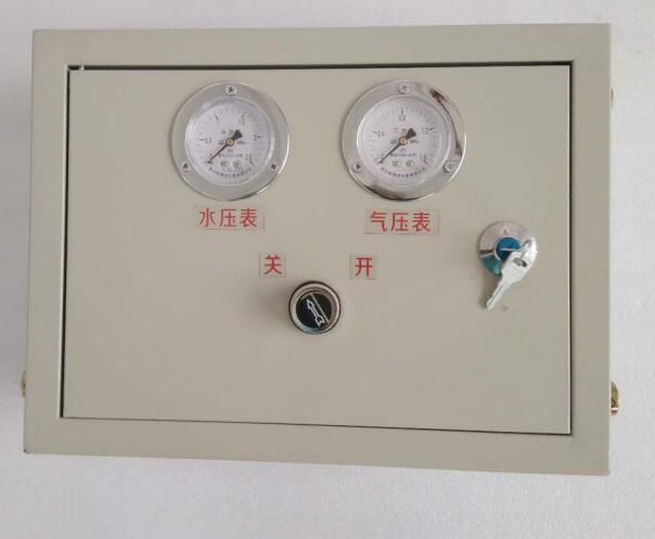 ZPFS氣控式風(fēng)水聯(lián)動噴霧降塵裝置控制箱(以下簡稱控制箱)采用內(nèi)置風(fēng)、水控制閥對裝置用風(fēng)、水壓力進行調(diào)控,對風(fēng)水比例進行均衡,采用氣控閥(控制箱圖片上的“開關(guān)”)控制噴霧裝置的開啟與關(guān)閉。控制箱門扇上鑲嵌氣控閥(開關(guān)旋鈕)控制噴霧裝置的開啟與關(guān)閉,鑲嵌有水壓表、氣壓表,分別顯示調(diào)控后的水、氣壓力。